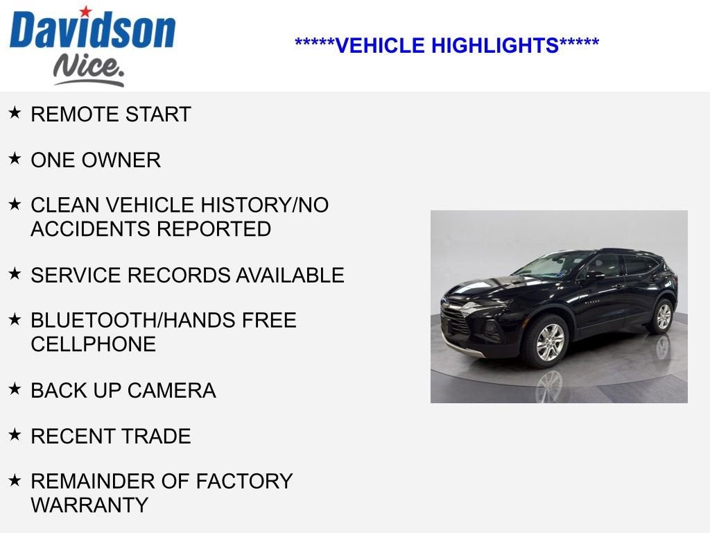 REMOTE START, ONE OWNER, CLEAN VEHICLE HISTORY/NO ACCIDENTS REPORTED, SERVICE RECORDS AVAILABLE, Bluetooth®/HANDS FREE CELLPHONE, BACK UP CAMERA, RECENT TRADE, REMAINDER OF FACTORY WARRANTY, FRESH OIL CHANGE, FULLY DETAILED, ALL WHEEL DRIVE, AWD, 4-Wheel Disc Brakes, ABS brakes, Black Roof Rails, Child-Seat-Sensing Airbag, Convenience & Driver Confidence Package, Dual front impact airbags, Dual front side impact airbags, Emergency communication system: OnStar and Chevrolet connected services capable, Exterior Parking Camera Rear, Front anti-roll bar, Heated Driver & Front Passenger Seats, Inside Rear-View Auto-Dimming Mirror, Knee airbag, Lane Change Alert w/Side Blind Zone Alert, Occupant sensing airbag, Outside Heated Power-Adjustable Body-Color Mirrors, Overhead airbag, Preferred Equipment Group 2LT, Rear anti-roll bar, Rear Cross Traffic Alert, Rear Park Assist w/Audible Warning, Rear Power Programmable Liftgate, Remote Start, SiriusXM Radio, Universal Home Remote, Wheels: 18 Bright Silver Aluminum. 2022 Chevrolet Blazer LT AWD Odometer is 2976 miles below market average! Black 9-Speed Automatic with Overdrive 2.0L Turbocharged