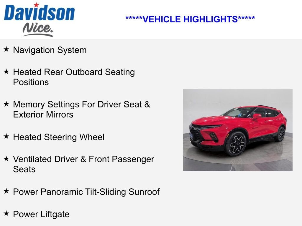 Navigation System, Heated Rear Outboard Seating Positions, Memory Settings For Driver Seat & Exterior Mirrors, Heated Steering Wheel, Ventilated Driver & Front Passenger Seats, Power Panoramic Tilt-Sliding Sunroof, Power Liftgate, Heated Driver & Front Passenger Seats, Blazer RS, 4D Sport Utility, 3.6L V6 SIDI, 9-Speed Automatic with Overdrive, AWD, Red Hot, Jet Black With Red Accents Leather.
