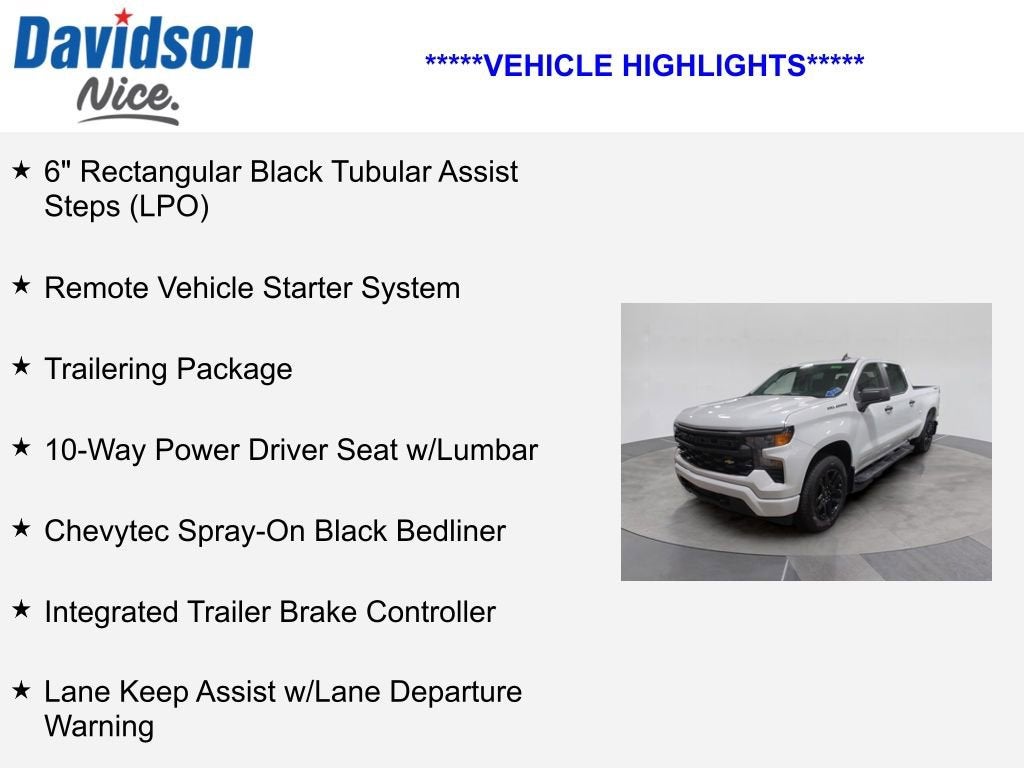 6 Rectangular Black Tubular Assist Steps (LPO), Remote Vehicle Starter System, Trailering Package, 10-Way Power Driver Seat w/Lumbar, Chevytec Spray-On Black Bedliner, Integrated Trailer Brake Controller, Lane Keep Assist w/Lane Departure Warning, Silverado 1500 Custom, 4D Crew Cab, 2.7L I4 Turbocharged DOHC 16V LEV3-SULEV30 310hp, 8-Speed Automatic, 4WD, Summit White, Jet Black Cloth.