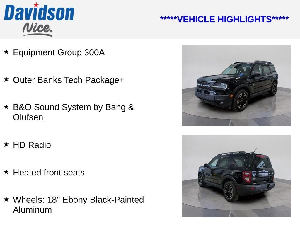 Blending rugged capability with refined style, the 2025 Ford Bronco Sport Outer Banks is the perfect companion for your next adventure. With its impressive performance, advanced technology, and premium amenities, this SUV is ready to elevate your driving experience.